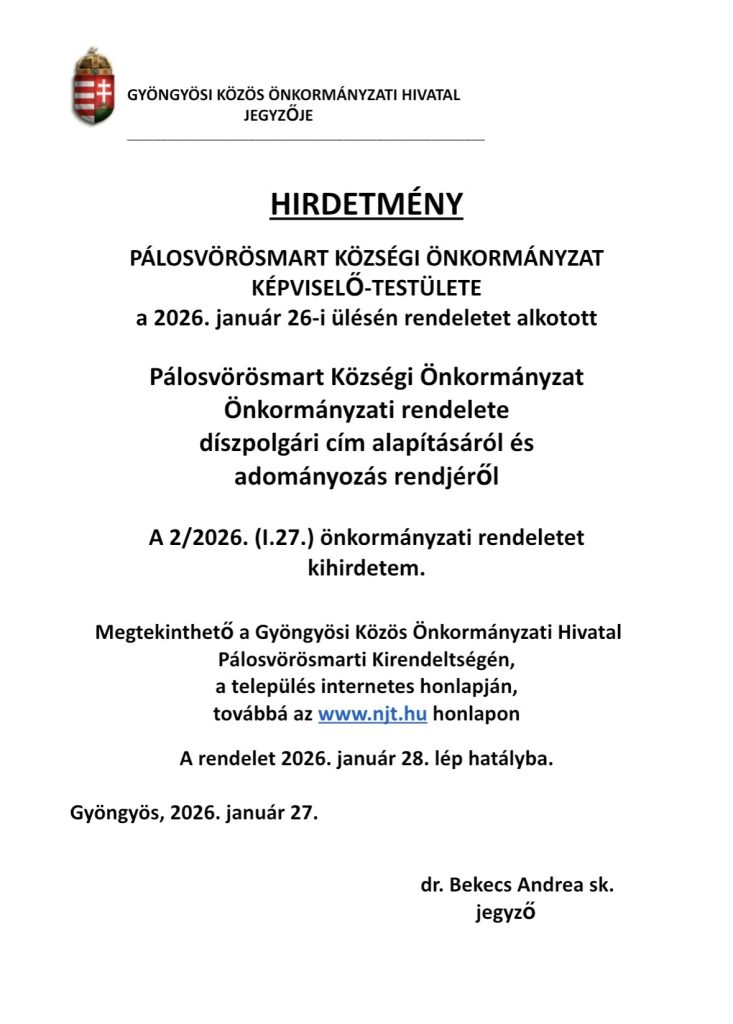 Hirdetmény a képviselő-testület 2026. január 26-i ülésének rendeletéről (2)